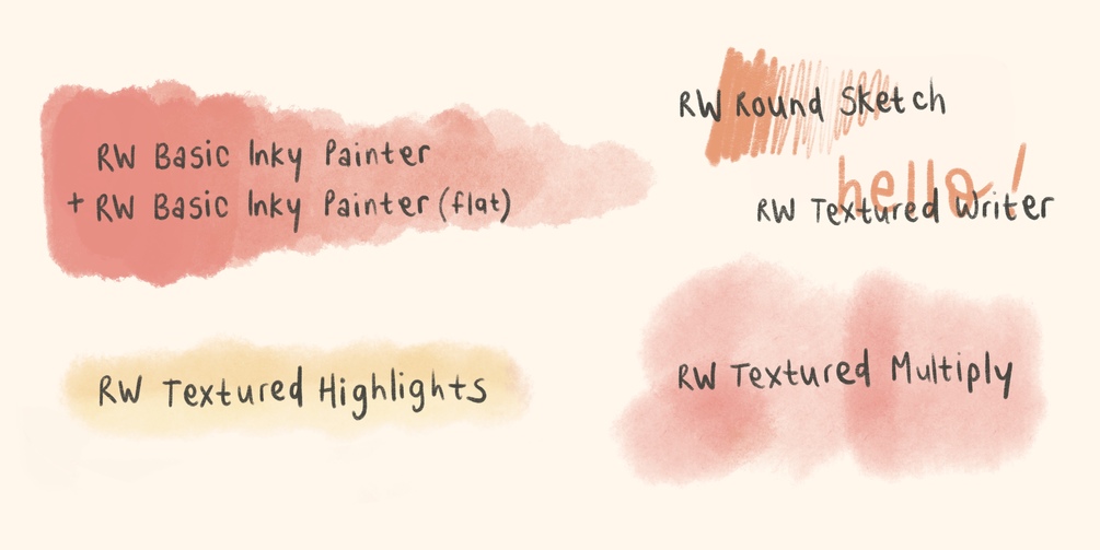 RW Inky Painter - An “inky” brush that goes from a lovely light wash to nearly full opacity with pressure. It also has a super fun, but subtle color jitter with every stroke - to give a more “traditional” feel.